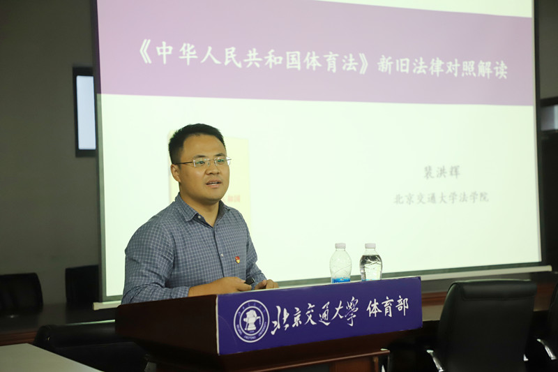 参观学习活动前,嘟嘟成人网 公法学系教师裴洪辉结合我国《体育法》修订的最新情况,从修订的背景过程、修订原则、主要内容等为体育部全体教师开展了专题培训讲座。