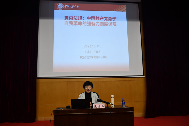 王建芹教授从建党百年的两个重大发布——比较完善的党内法规体系如期形成和“跳出历史周期律”的第二个答案开始说起,强调了党内法规制度体系建设在社会主义法治体系建设中的重要地位和重大意义。王教授系统回顾了党内法规制度建设萌芽和形成、探索和曲折、恢复和发展、创新和完善的百年历程,对党内法规的相关理论进行了讲解,包括党的纪律、党的规矩与党内法规的概念辨析、依规治党与法治中国建设的实践关系、党内法规与国家法律的规范关系等,并就以自我革命精神推进党内法规制度如何落地落实展开了深入阐述。“依规治党深入党心,依法治国才能深入民心”。王建芹教授总结到:党规之治是马克思主义法治理论中国化的最新成果!