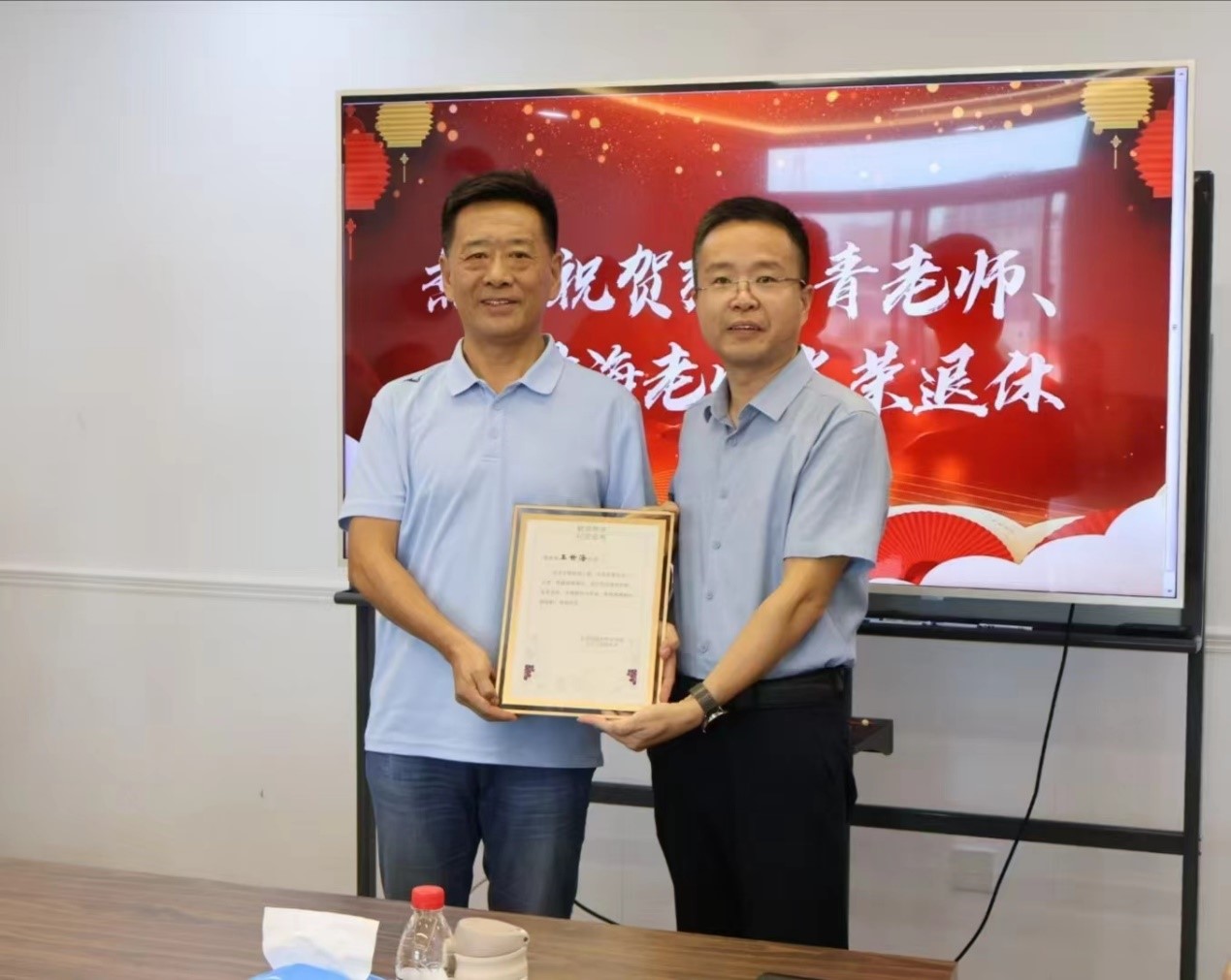 党委书记张立学为王世海老师颁发荣休证书并作总结讲话,他用“感谢、感动、感悟”三个关键词,代表学院表达对两位老师的崇高敬意和衷心感谢,结合两位老师的不同风格特点高度肯定了他们为学院发展做出的卓越贡献,号召全院教师特别是青年教师要以两位老师为榜样,把学院的事业传承好、发展好,希望两位老师继续关心支持学院的发展,学院也将想方设法做好荣休教师的服务工作。