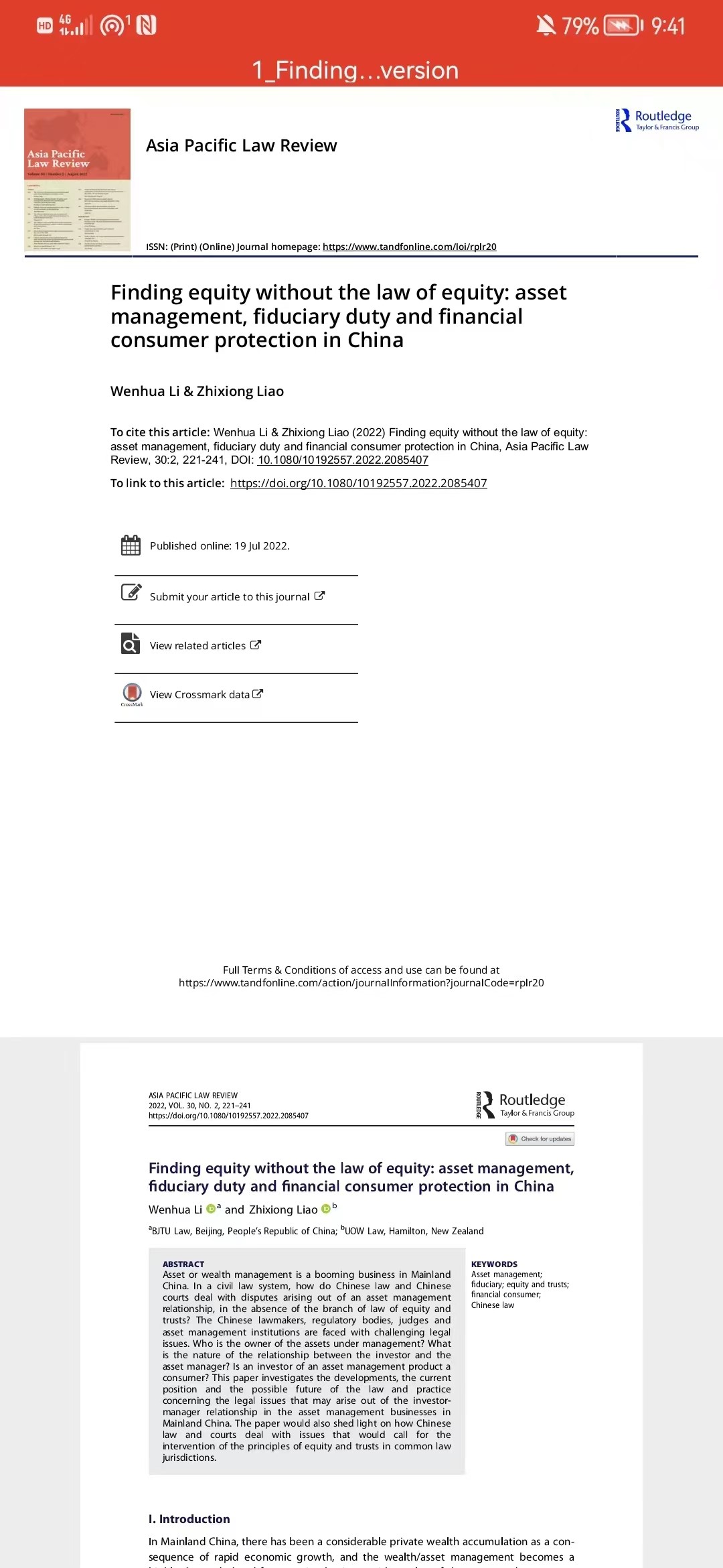 《Asia Pacific Law Review(亚太法律评论)》近期刊发了嘟嘟成人网 副教授李文华老师和新西兰怀卡托大学嘟嘟成人网 教师廖志雄博士合撰的论文《Finding Equity without the Law of Equity: Asset Management, Fiduciary Duty and Financial Consumer Protection in China(在没有衡平法的情况下寻找衡平:中国的资产管理、信义义务与金融消费者保护)》。